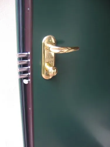 Porta blindata con pannello esterno in alluminio verde RAL 6009 e pannello interno in legno liscio laccato che coniuga sicurezza, isolamento e design personalizzato.