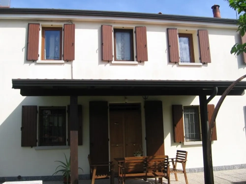 Lo scuro in legno a doghe verticali in multistrato di Okoumé unisce solidità ed eleganza tradizionale. Le doghe verticali interne ed esterne conferiscono un aspetto classico e armonioso, mentre la chiusura a tre punti con spagnoletta e i cardini con fissaggio a fialetta chimica assicurano stabilità, durata e sicurezza.